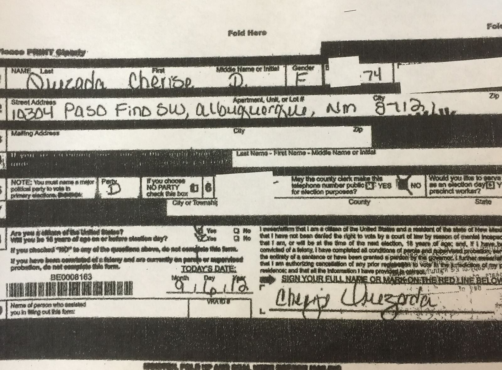 As can be seen at right on her voter registration form and below in the Declaration of Candidacy (which she apparently also signed as the declarant), Cherise Quezada's handwriting is characterized by large, rounded, bulbous lettering. The documents appear to match.