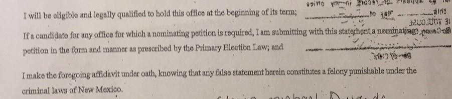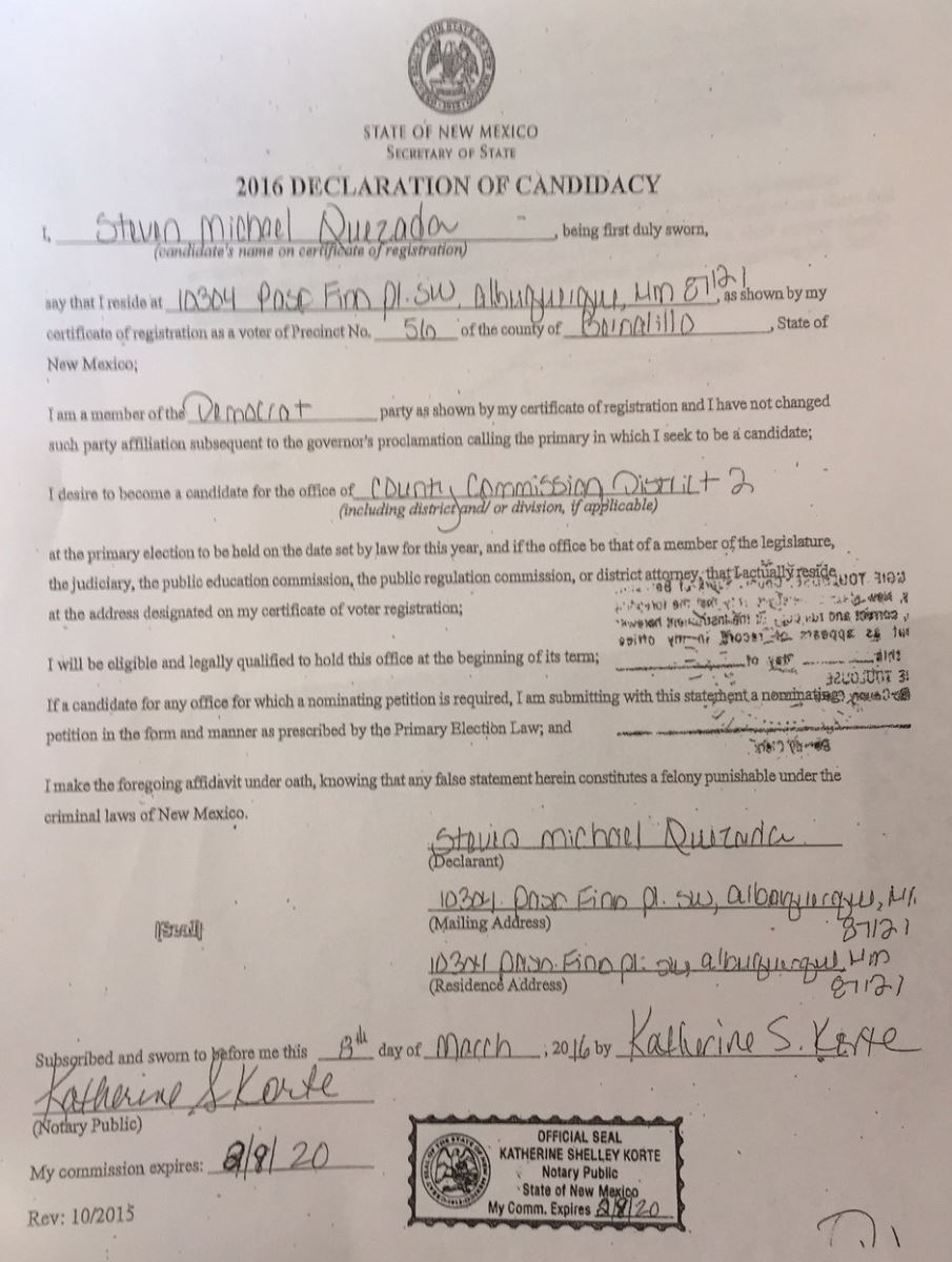 On March 8, 2016 Katherine Korte, an employee of the Bernalillo County Clerk's office, notarized a Declaration of Candidacy for Steven Michael Quezada. That may not be where the trouble begins, but it's certainly a part of the confusion.