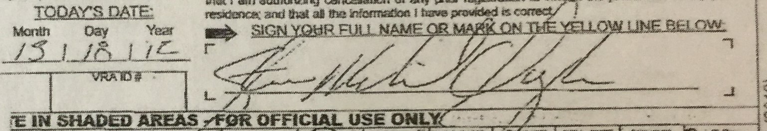 In other words, it appears his wife printed his name and all the required information on the form, and then also printed her husband's name in lieu of letting him sign the oath.